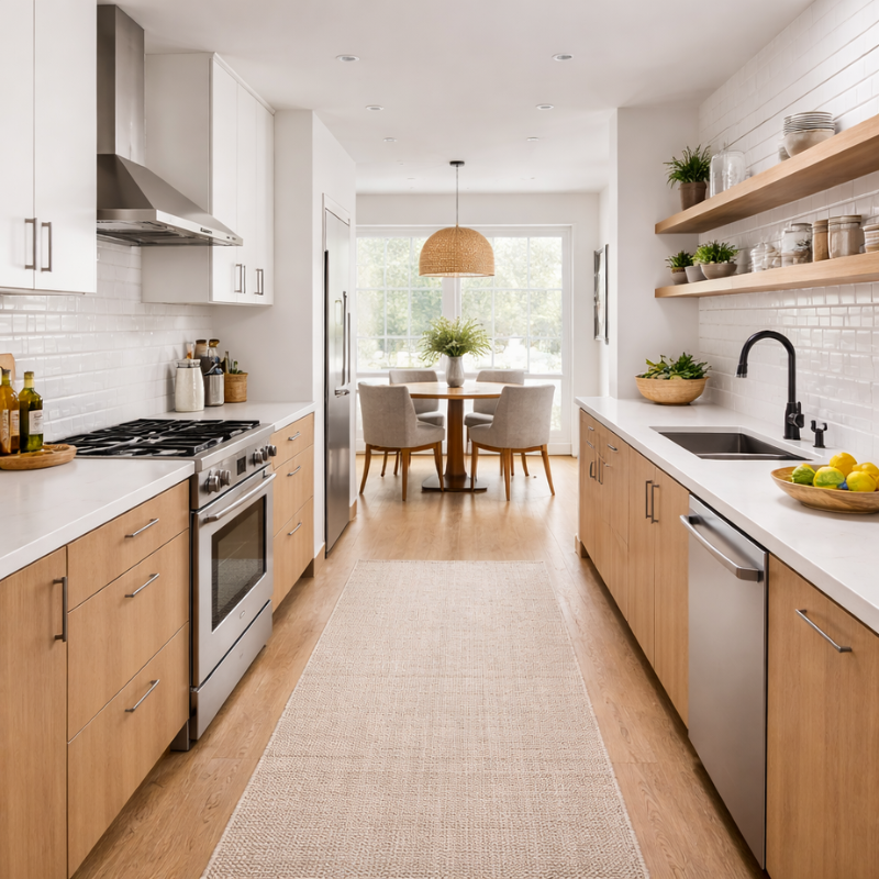 While traditional galley kitchens lack dining space, modern designs often open one side to incorporate a compact dining nook or connect directly to a dining area, balancing efficiency with social interaction.