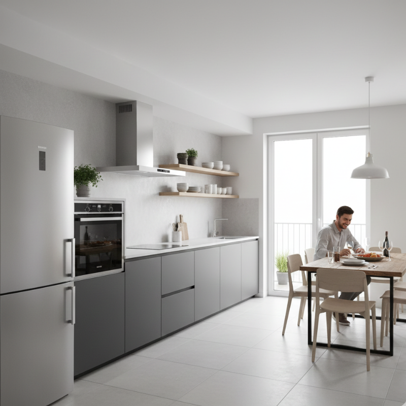 The one-wall kitchen is a popular choice for studio apartments, small homes, and open-plan living spaces. All appliances, cabinets, and countertops are arranged along a single wall, keeping everything within easy reach.