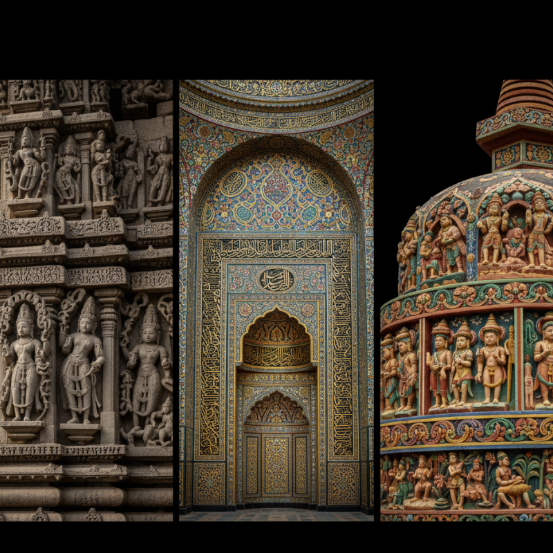 Decoration in religious architecture is rarely superficial. Carvings, mosaics, calligraphy, and sculptures serve as visual theology.
