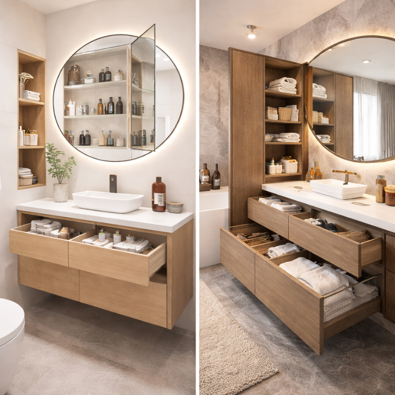 In compact bathrooms, recessed shelves, vanity drawers, and mirrored cabinets provide storage without occupying extra space. Vertical storage, such as tall cabinets or open shelving, makes use of unused wall areas.
