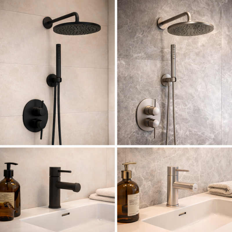 Matte black, brushed nickel, and chrome finishes remain popular for their versatility and clean appearance. Consistency is key—using the same finish across taps, shower fittings, and accessories creates a cohesive design.