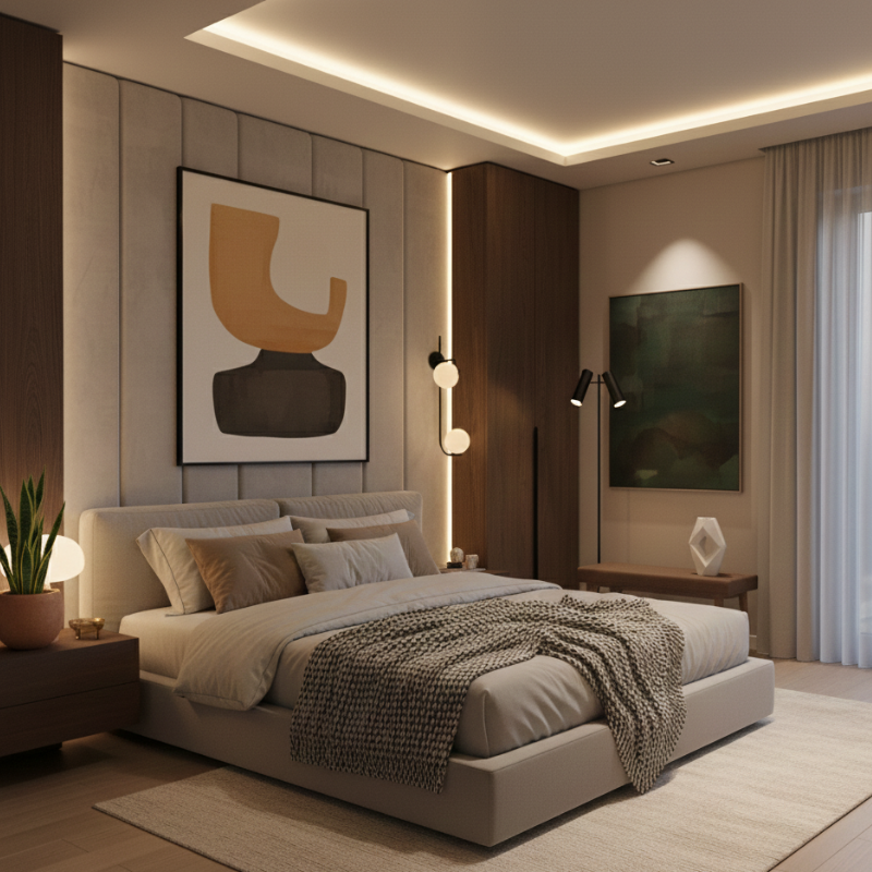 Color sets the foundation of any bedroom interior. Modern bedrooms typically use neutral shades such as white, beige, grey, and soft earth tones. These colors create a soothing environment and make the space feel larger and brighter.