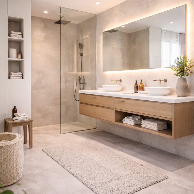 Small personal touches—like indoor plants suitable for humid environments, natural fabrics, or subtle décor pieces—add warmth without cluttering the space. The aim is to create a bathroom that feels relaxing, personal, and aligned with the homeowner’s lifestyle.